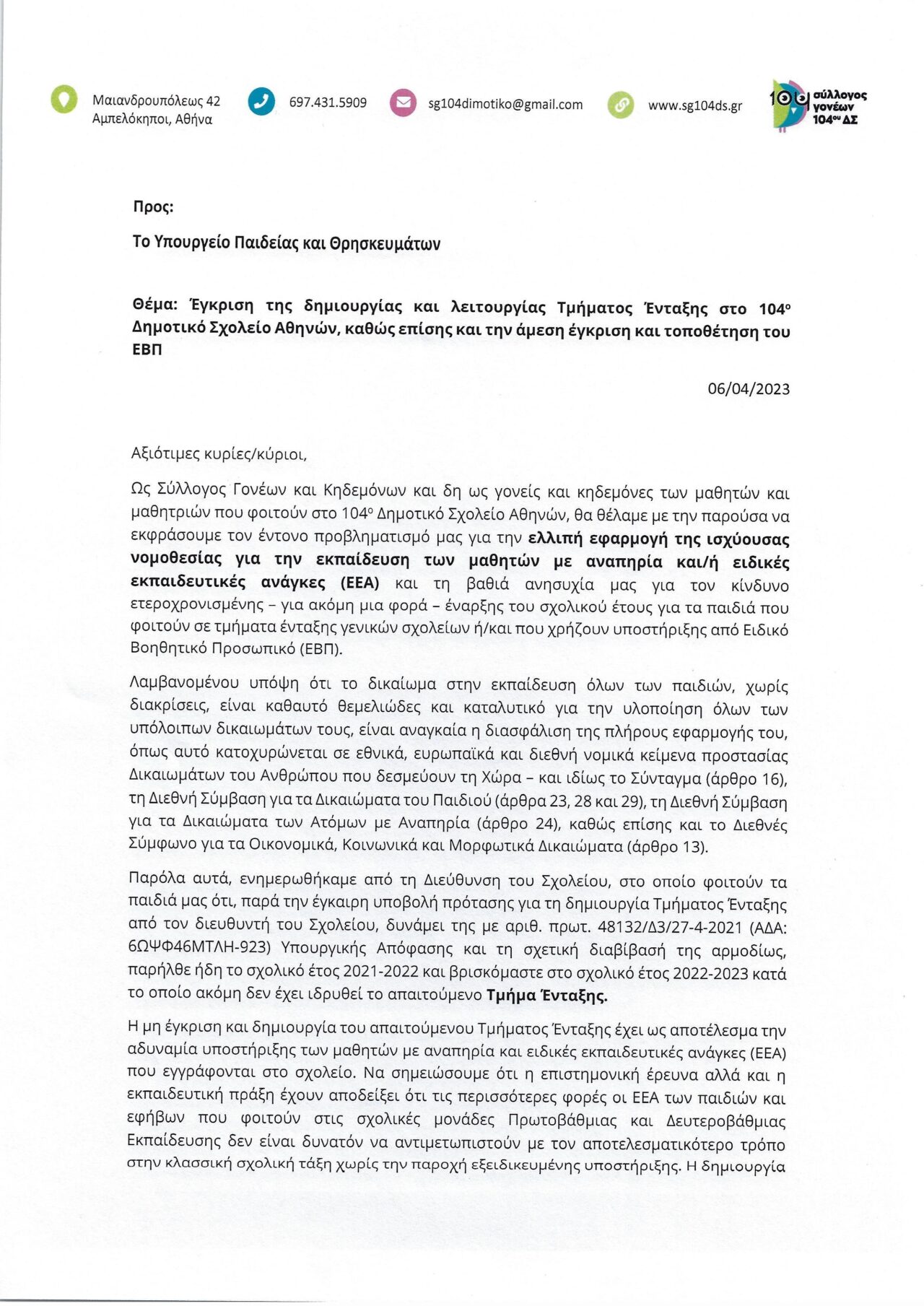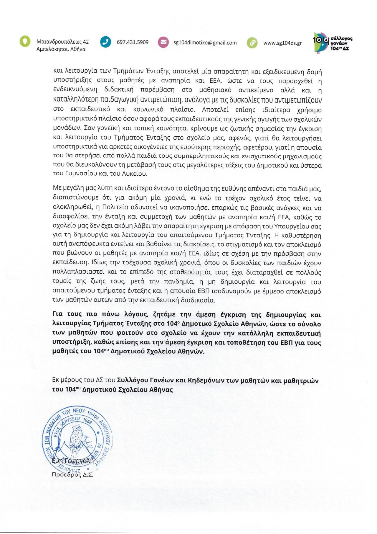 Κατόπιν σχετικών αιτημάτων γονέων και ενόσω συντρέχουν οι προυποθέσεις για την λειτουργία Τμήματος Ένταξης στο σχολείο μας, βρίσκουμε ιδιαίτερα προβληματική τη μη λειτουργία του. Το αίτημα εστάλη απο τον διευθυντή τον Απρίλιο του 2021, εγκρίθηκε διότι πληρούνται τα προαπαιτούμενα και επειδή έκτοτε δεν έχει γίνει καμία κίνηση για την έναρξη του, σαν Σύλλογος γονέων και κηδεμόνων,ποστείλαμε την ακόλουθη επιστολή. Η επιστολή εστάλη σε διάφορα τμήματα του Υπουργείου Παιδείας καθώς και σε λοιπούς σχετικούς φορείς.