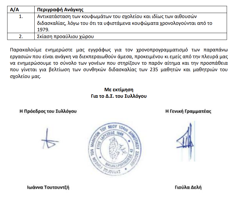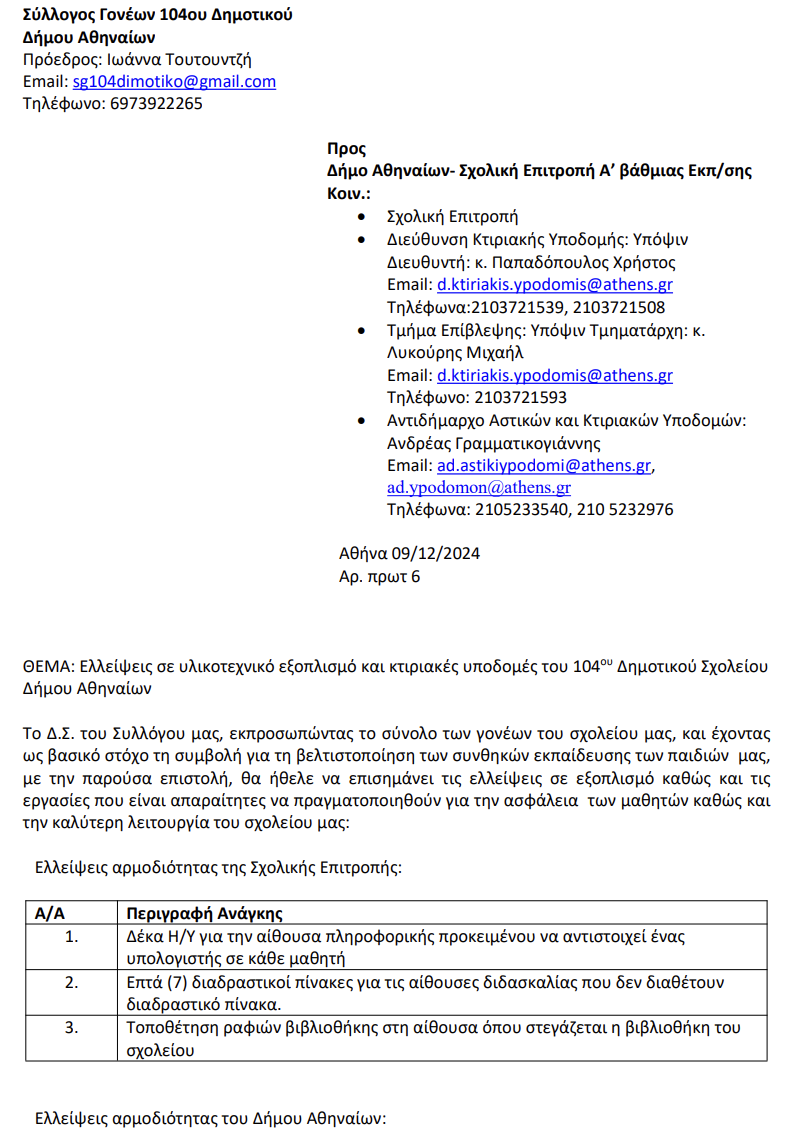 Επιστολή για τις ελλείψεις σε εξοπλισμό - υποδομές του σχολείου 9/12/2024