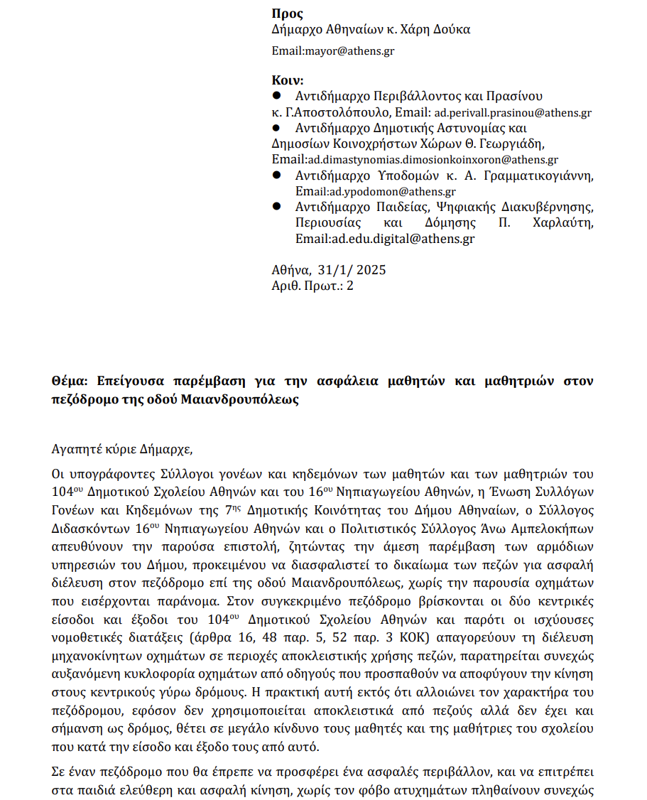 Επιστολή για τον πεζόδρομο Μαιανδρουπόλεως 31/1/2025