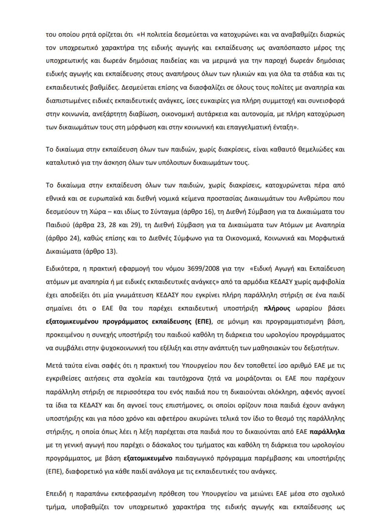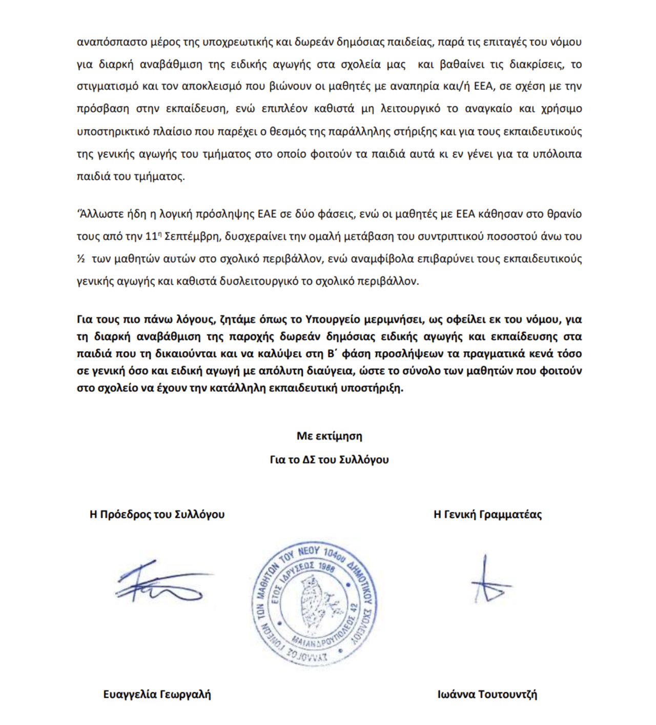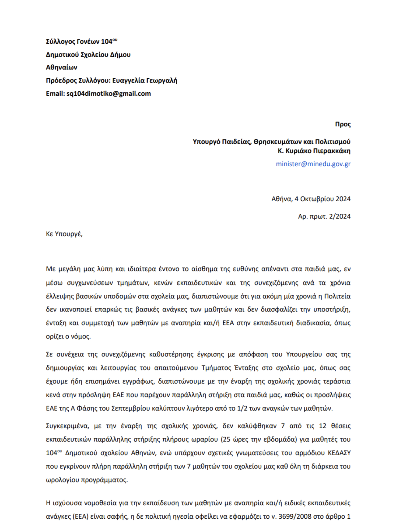 Επιστολή προς Υπουργό Παιδείας και Θρησκευμάτων Οκτώβριος 2024