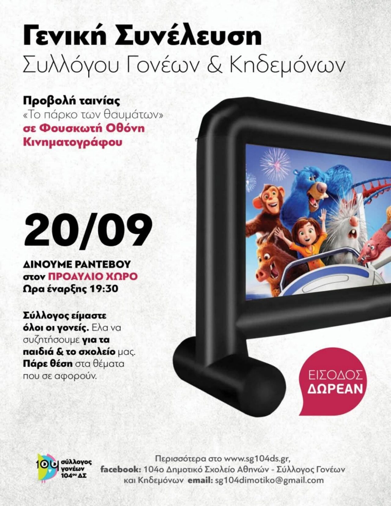Όλα τα παιδιά θα απολαύσουν ταινία κινουμένων σχεδίων σε μεγάλη οθόνη, τρώγοντας ποπ κορν, στο προαύλιο του σχολείου, ενώ οι γονείς θα πραγματοποιήσουμε την ίδια ώρα την ετήσια Γενική Συνέλευση.