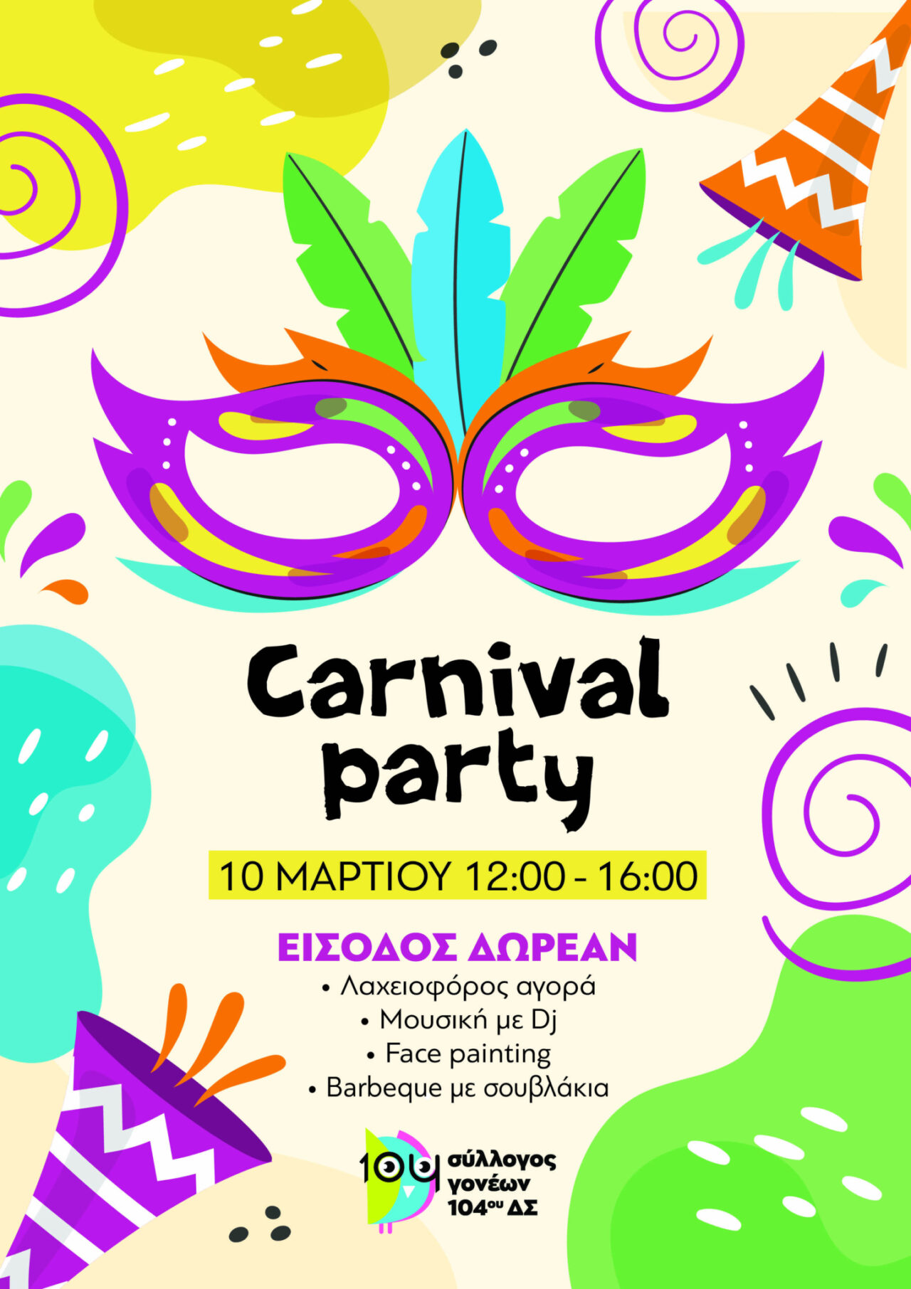Ελάτε την Κυριακή 10 Μαρτίου από τις 12:00 έως τις 16:00 να διασκεδάσουμε στο αποκριάτικο πάρτυ που θα πραγματοποιηθεί στον προαύλιο χώρο του σχολείου μας!